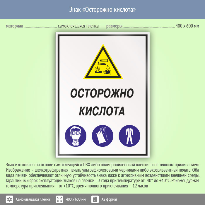 Знак «Осторожно кислота», КЗ-61 (пленка, 400х600 мм) в Альметьевске купить