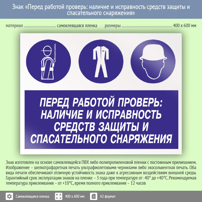 Знак «Перед работой проверь: наличие и исправность средств защиты и спасательного снаряжения», КЗ-64 (пленка, 600х400 мм) в Альметьевске купить