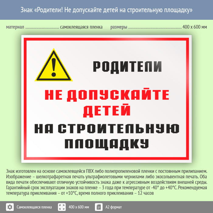 Знак «Родители! Не допускайте детей на строительную площадку», КЗ-84 (пленка, 600х400 мм) в Альметьевске купить