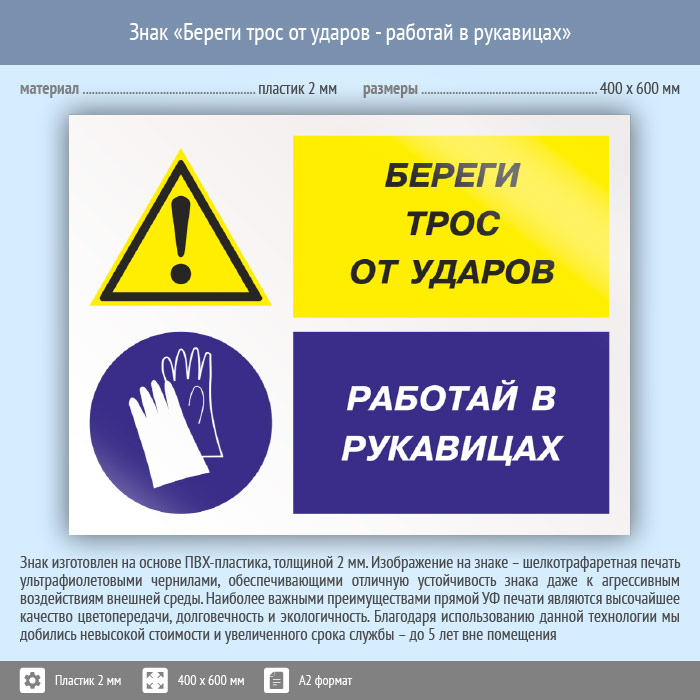 Знак «Береги трос от ударов - работай в рукавицах», КЗ-03 (пластик, 600х400 мм) в Альметьевске купить