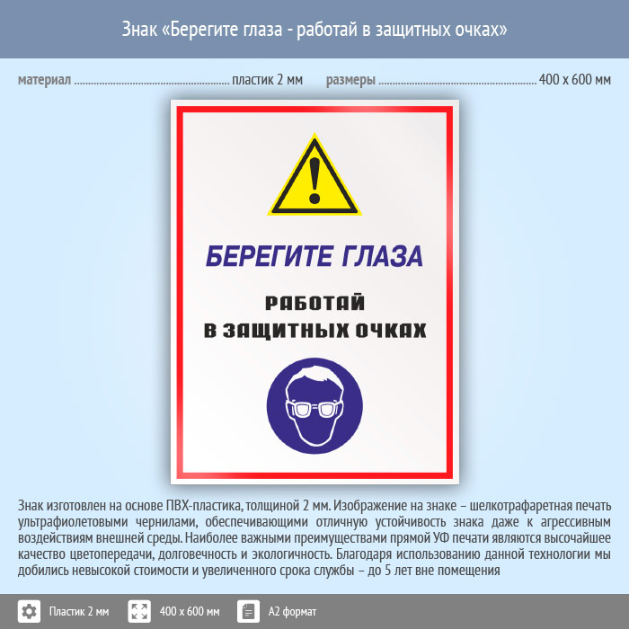 Знак «Берегите глаза - работай в защитных очках», КЗ-04 (пластик, 400х600 мм) в Альметьевске купить