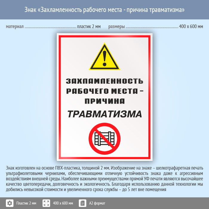 Знак «Захламленность рабочего места - причина травматизма», КЗ-21 (пластик, 400х600 мм) в Альметьевске купить