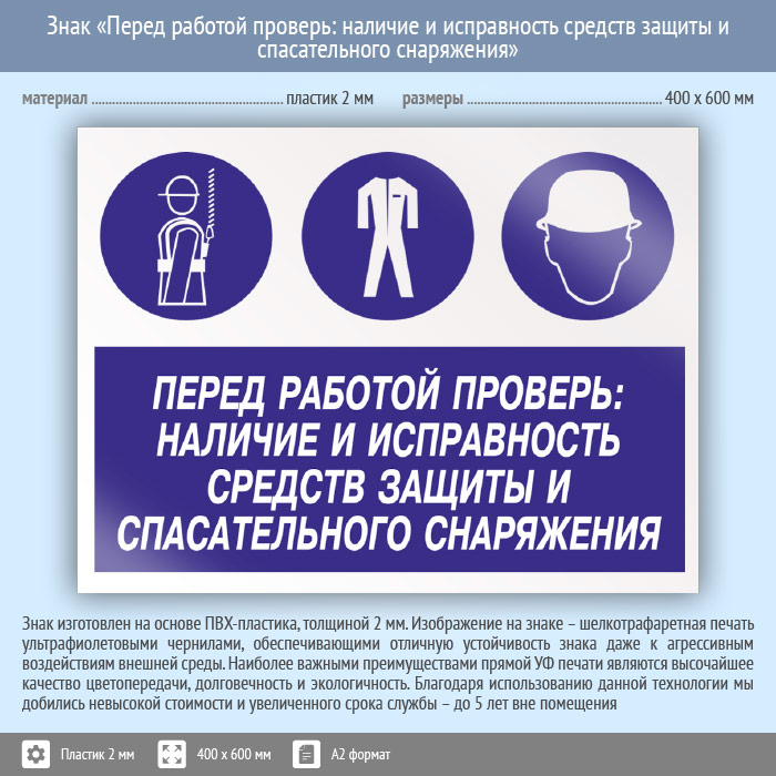 Знак «Перед работой проверь: наличие и исправность средств защиты и спасательного снаряжения», КЗ-64 (пластик, 600х400 мм) в Альметьевске купить