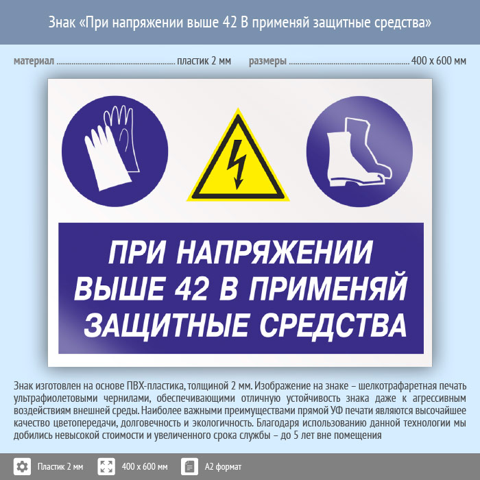 Знак «При напряжении выше 42 В применяй защитные средства», КЗ-72 (пластик, 600х400 мм) в Альметьевске купить