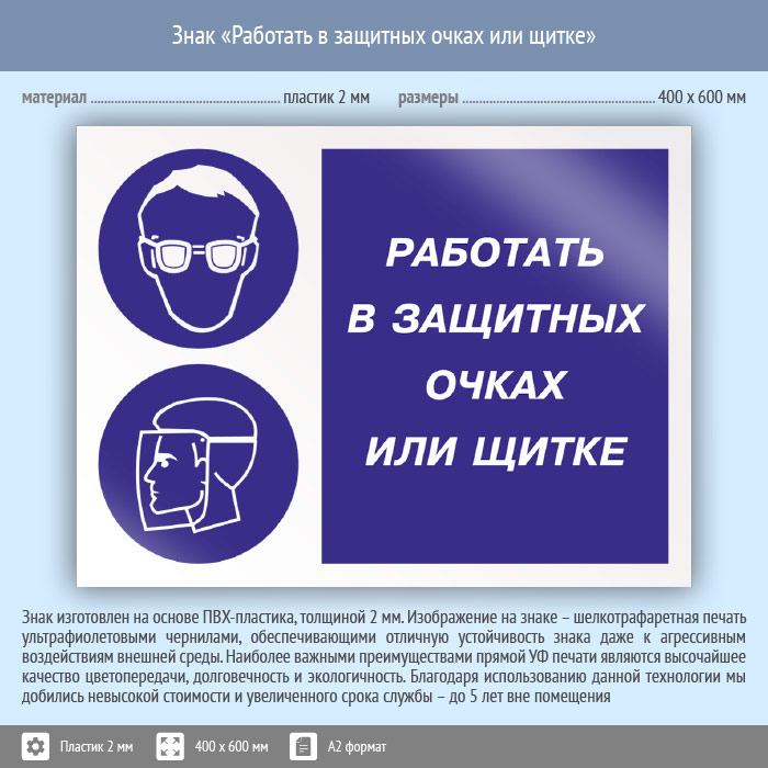 Знак «Работать в защитных очках или щитке», КЗ-80 (пластик, 600х400 мм) в Альметьевске купить
