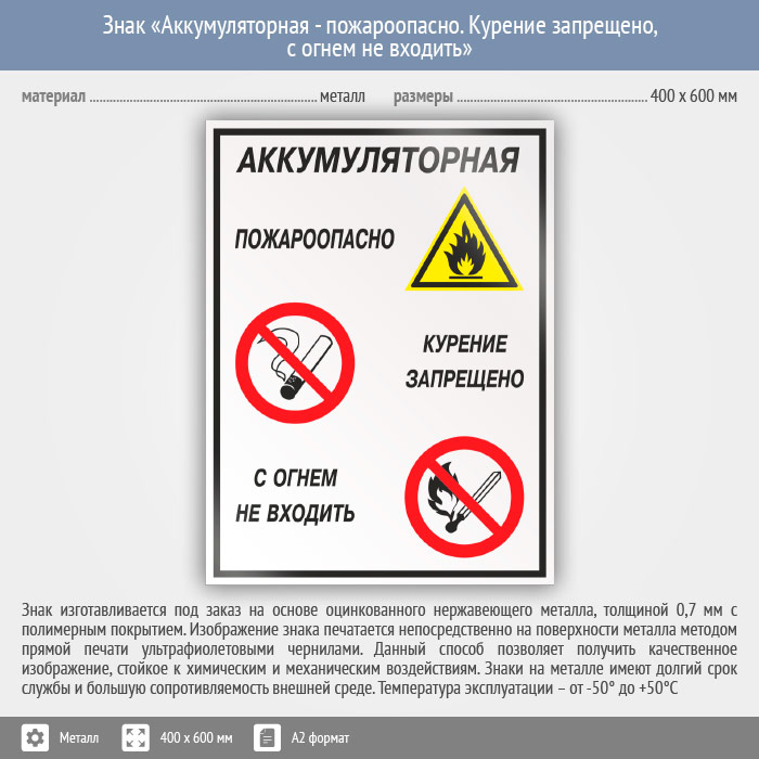 Знак «Аккумуляторная - пожароопасно. Курение запрещено, с огнем не входить», КЗ-01 (металл, 400х600 мм) в Альметьевске купить