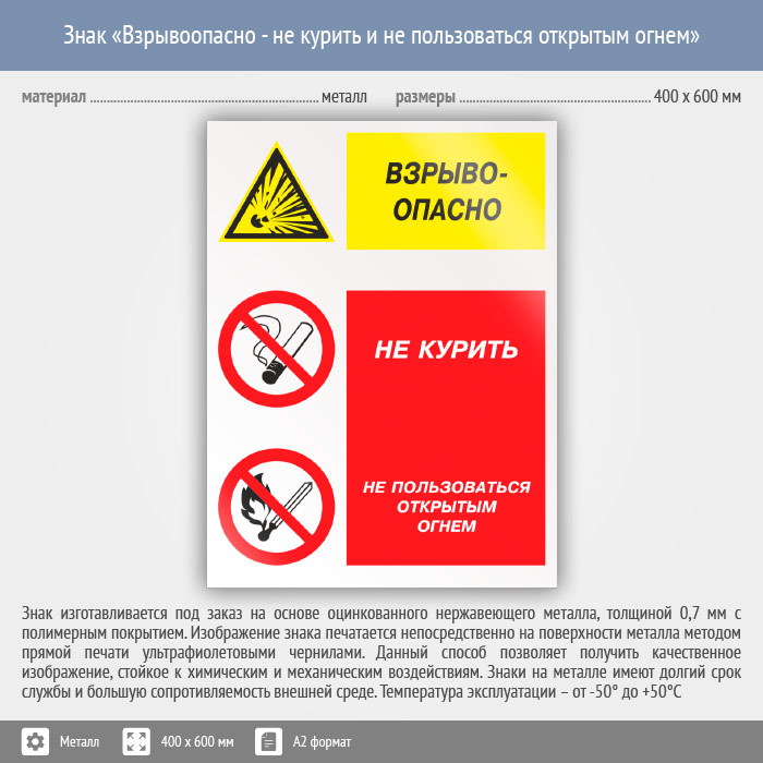 Знак «Взрывоопасно - не курить и не пользоваться открытым огнем», КЗ-08 (металл, 400х600 мм) в Альметьевске купить