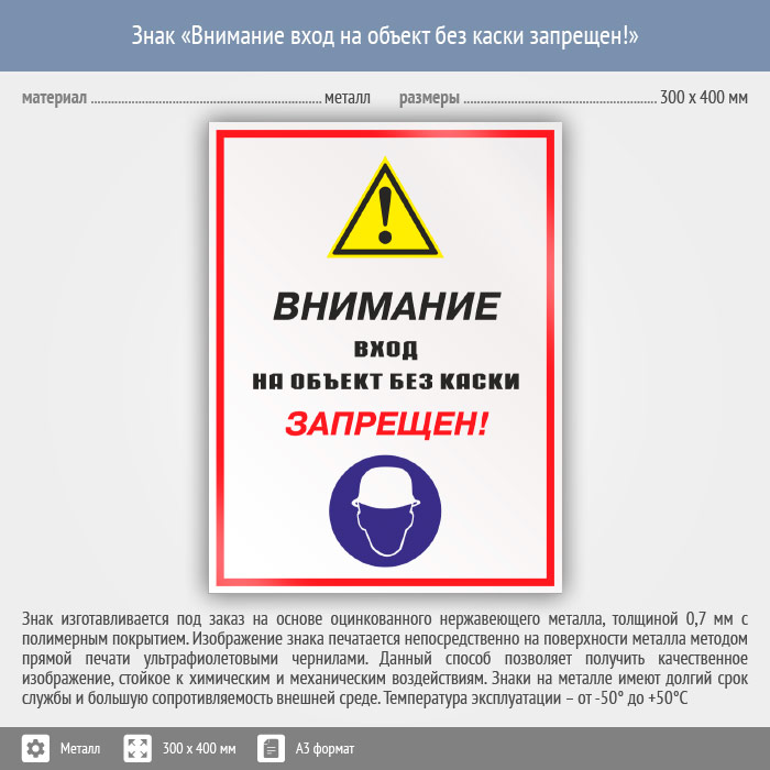 Знак «Внимание вход на объект без каски запрещен!», КЗ-13 (металл, 300х400 мм) в Альметьевске купить