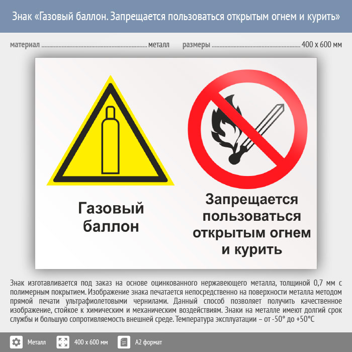 Знак «Газовый баллон. Запрещается пользоваться открытым огнем и курить», КЗ-19 (металл, 600х400 мм) в Альметьевске купить
