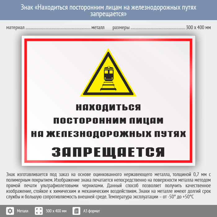 Знак «Находиться посторонним лицам на железнодорожных путях запрещается», КЗ-24 (металл, 400х300 мм) в Альметьевске купить