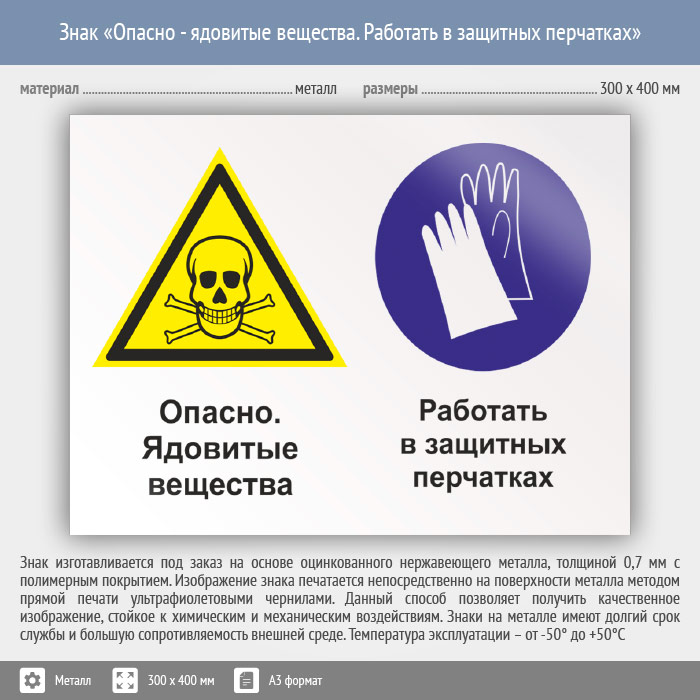 Знак «Опасно - ядовитые вещества. Работать в защитных перчатках», КЗ-43 (металл, 400х300 мм) в Альметьевске купить