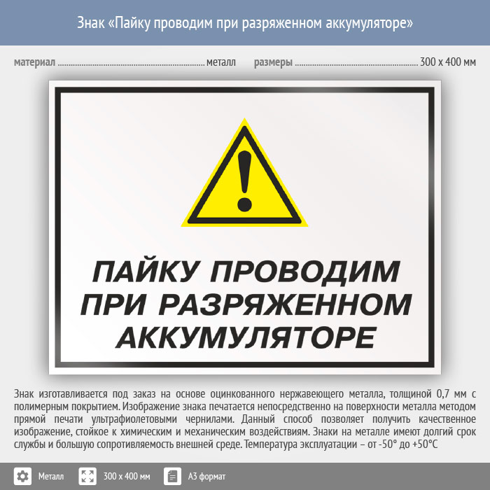 Знак «Пайку проводим при разряженном аккумуляторе», КЗ-62 (металл, 400х300 мм) в Альметьевске купить