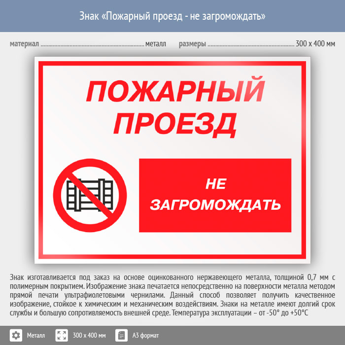 Знак «Пожарный проезд - не загромождать», КЗ-67 (металл, 400х300 мм) в Альметьевске купить