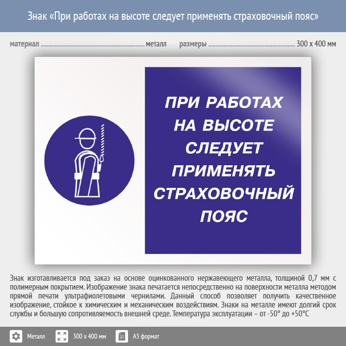 Знак «При работах на высоте следует применять страховочный пояс», КЗ-75 (металл, 400х300 мм) в Альметьевске купить