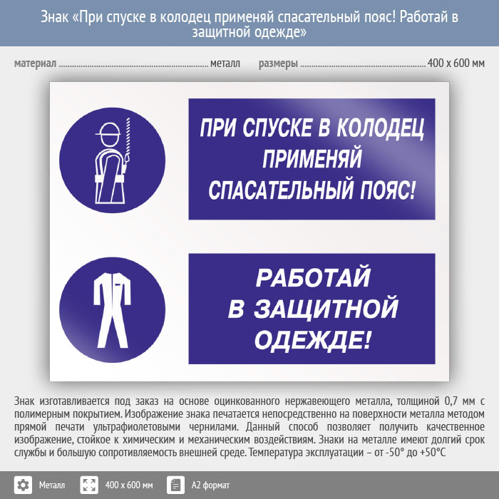 Знак «При спуске в колодец применяй спасательный пояс! Работай в защитной одежде», КЗ-76 (металл, 600х400 мм) в Альметьевске купить