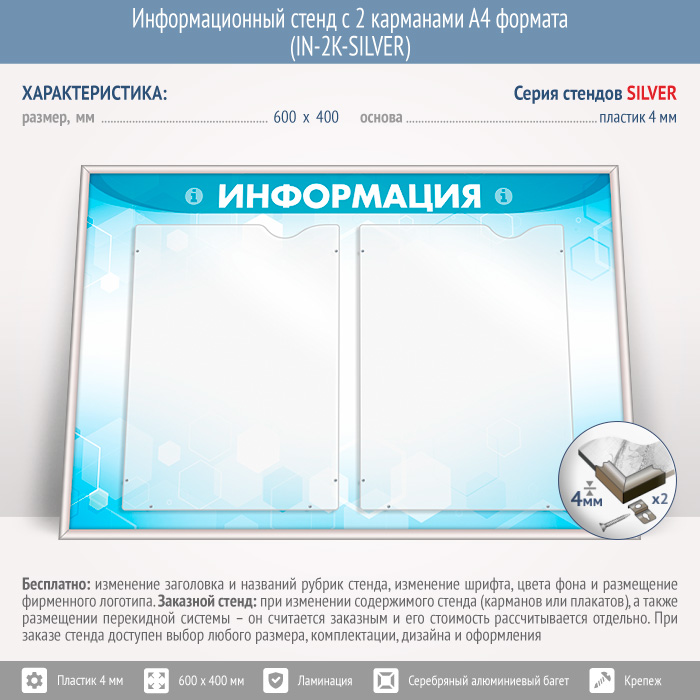 Информационный стенд с 2 карманами А4 формата (IN-2K-SILVER) в Альметьевске купить