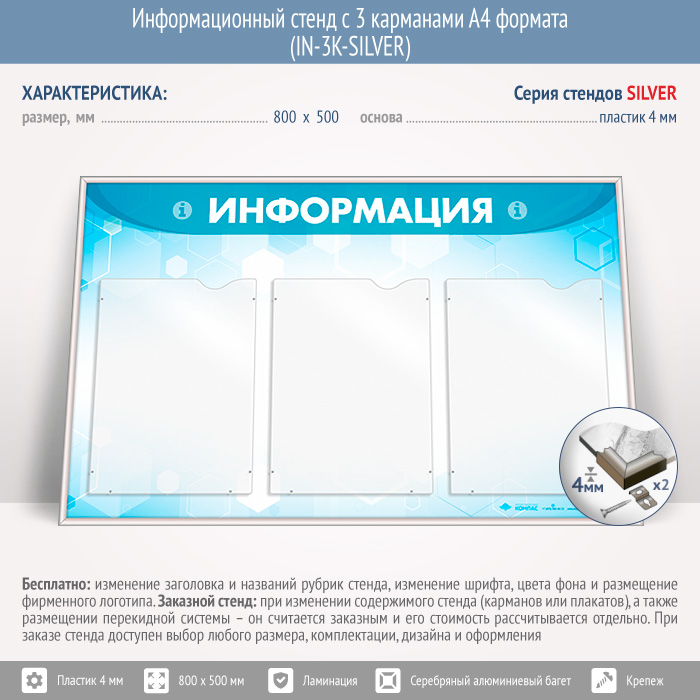 Информационный стенд с 3 карманами А4 формата (IN-3K-SILVER) в Альметьевске купить