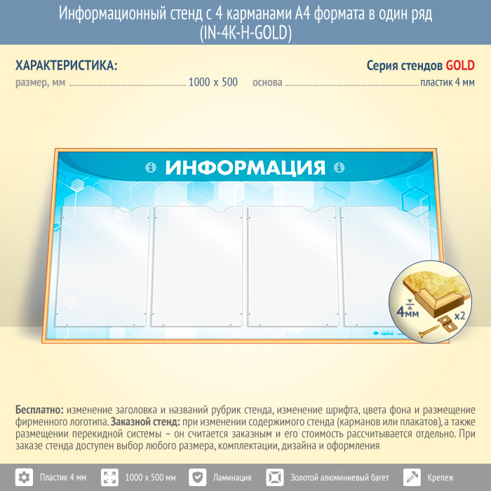 Информационный стенд с 4 карманами А4 формата в один ряд (IN-4K-H-GOLD) в Альметьевске купить