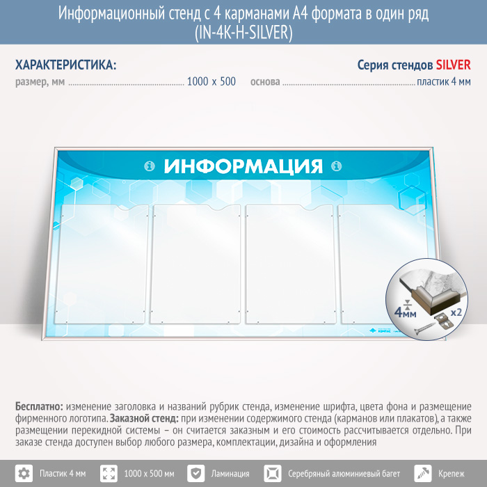 Информационный стенд с 4 карманами А4 формата в один ряд (IN-4K-H-SILVER) в Альметьевске купить