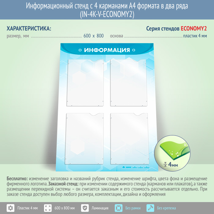 Информационный стенд с 4 карманами А4 формата в два ряда (IN-4K-V-ECONOMY2) в Альметьевске купить