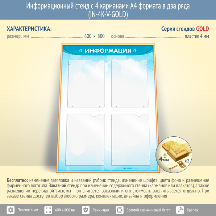 Информационный стенд с 4 карманами А4 формата в два ряда (IN-4K-V-GOLD) в Альметьевске купить
