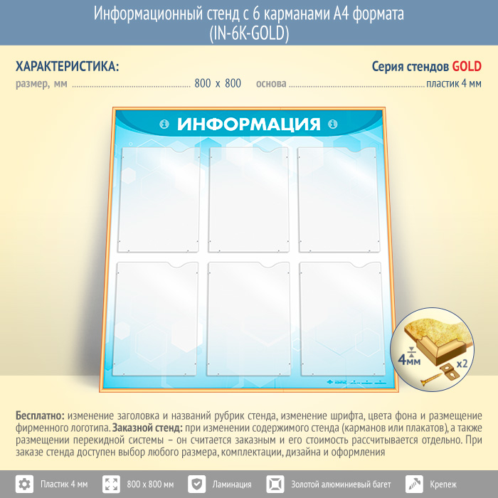 Информационный стенд с 6 карманами А4 формата (IN-6K-GOLD) в Альметьевске купить