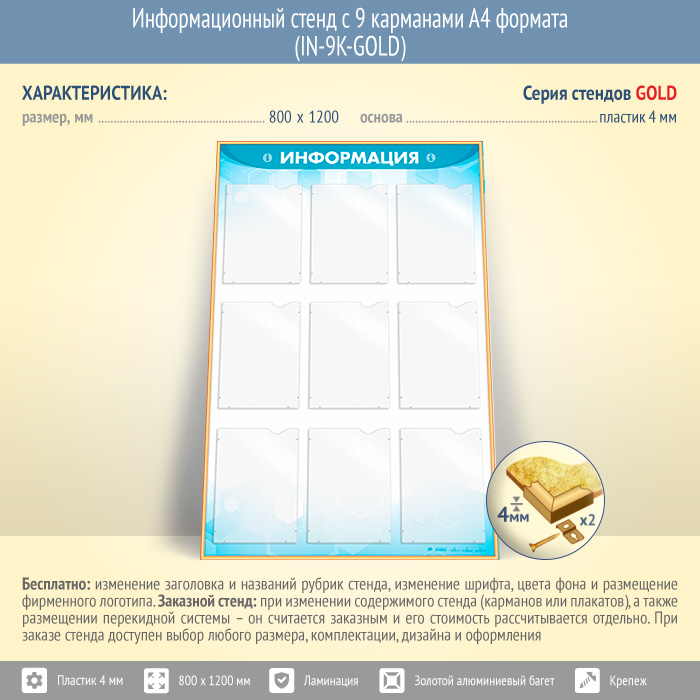 Информационный стенд с 9 карманами А4 формата (IN-9K-GOLD) в Альметьевске купить