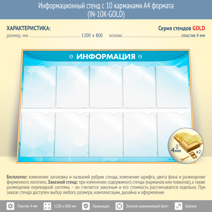 Информационный стенд с 10 карманами А4 формата (IN-10K-GOLD) в Альметьевске купить