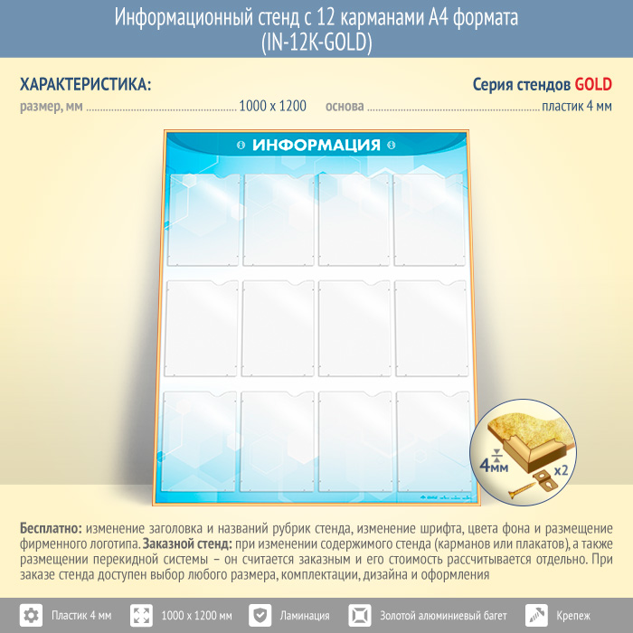 Информационный стенд с 12 карманами А4 формата (IN-12K-GOLD) в Альметьевске купить