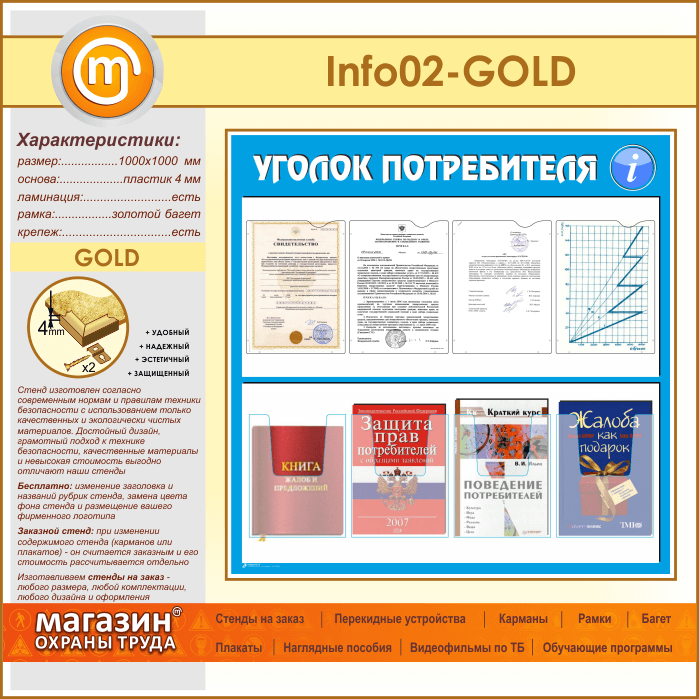 Стенд «Уголок потребителя» с 4 плоскими и 4 объемными карманами А4 формата (IN-02-GOLD) в Альметьевске купить