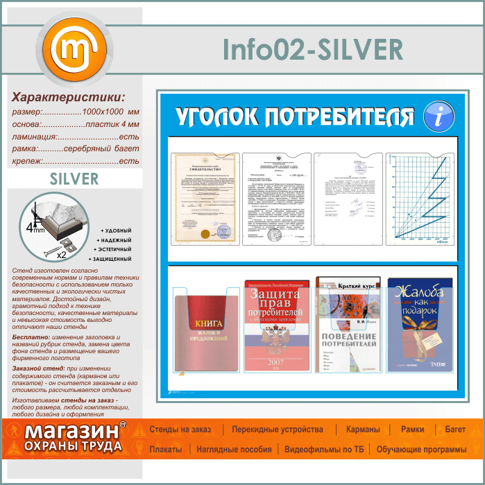 Стенд «Уголок потребителя» с 4 плоскими и 4 объемными карманами А4 формата (IN-02-SILVER) в Альметьевске купить