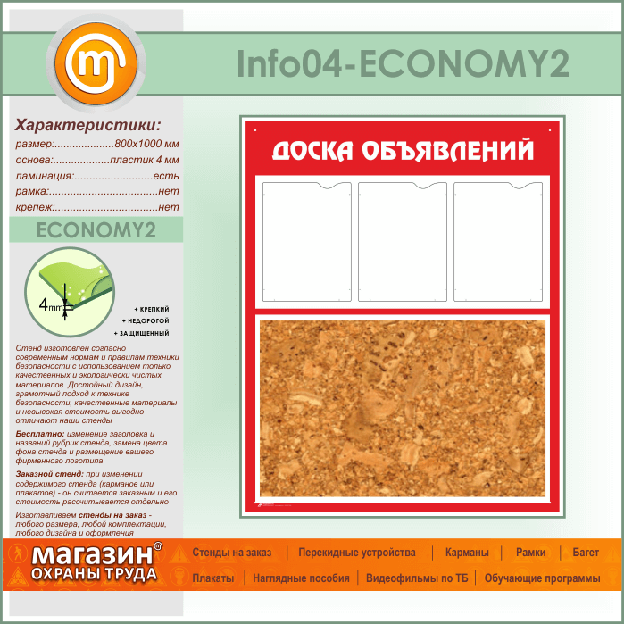 Стенд «Доска объявлений» с пробковым полотном и 3 карманами А4 формата (IN-04-ECONOMY2) в Альметьевске купить