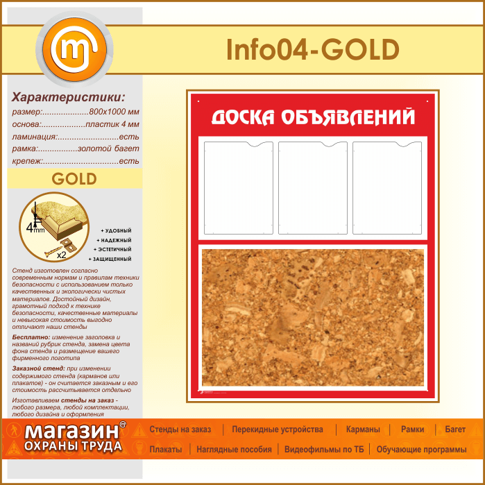 Стенд «Доска объявлений» с пробковым полотном и 3 карманами А4 формата (IN-04-GOLD) в Альметьевске купить