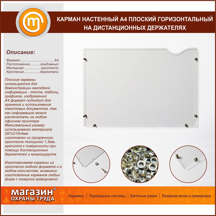 Карман настенный А4 плоский горизонтальный на дистанционных держателях