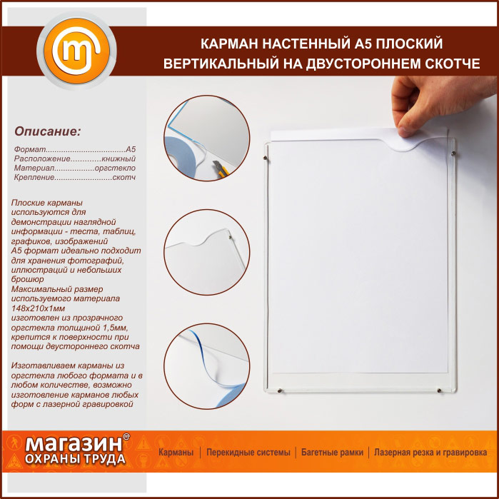 Карман настенный А5 плоский вертикальный на двустороннем скотче в Альметьевске купить