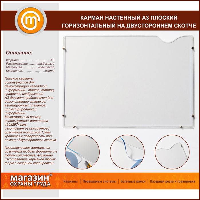 Карман настенный А3 плоский горизонтальный на двустороннем скотче в Альметьевске купить