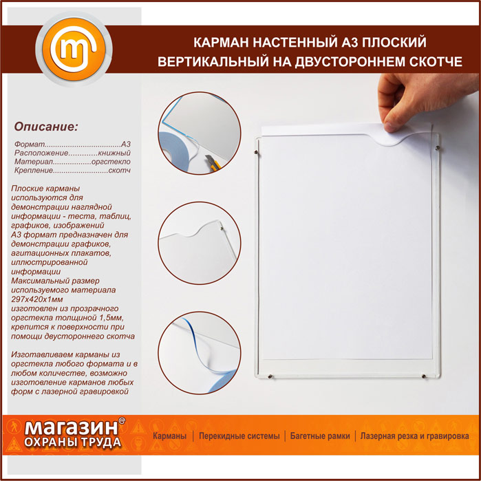 Карман настенный А3 плоский вертикальный на двустороннем скотче в Альметьевске купить