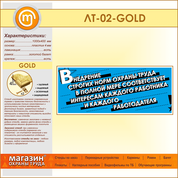 Лозунг «Внедрение строгих норм охраны труда...» (LT-02-GOLD) в Альметьевске купить