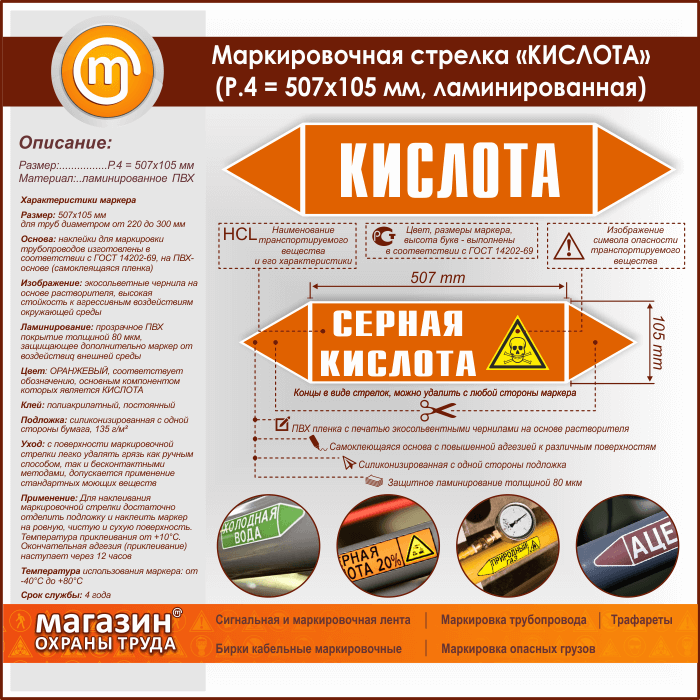 Маркировочная стрелка «КИСЛОТА» (P.4 = 507х105 мм, самоклеящаяся плёнка с ламинированием) в Альметьевске купить