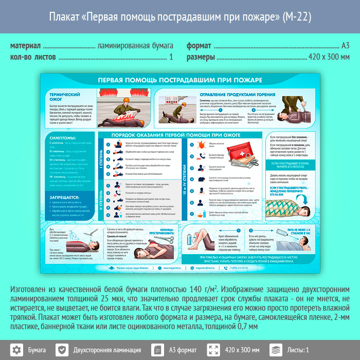 Плакат «Первая помощь пострадавшим при пожаре» (М-22, ламинированная бумага, А3, 1 лист) в Альметьевске купить
