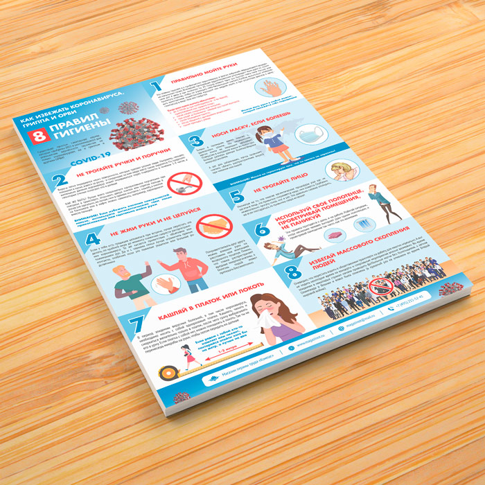 Плакат «Восемь правил гигиены. Как избежать коронавируса, гриппа и ОРВИ» (М-28, ламинированная бумага, А3, 1 лист) в Альметьевске купить