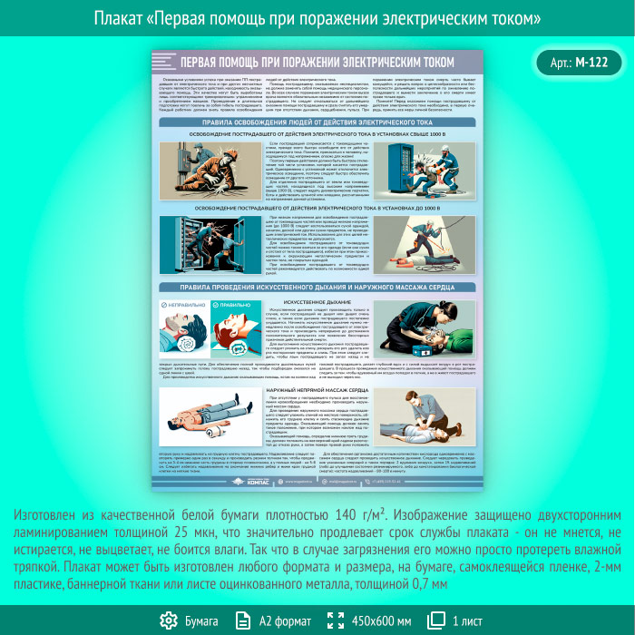Плакат «Первая помощь при поражении электрическим током» (М-122, ламинированная бумага, А2, 1 лист) в Альметьевске купить