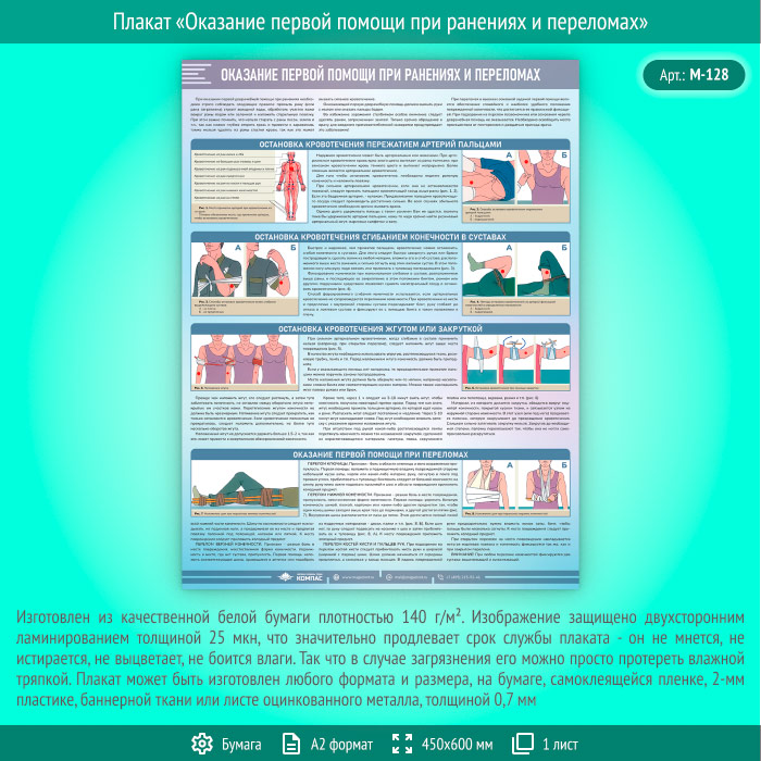 Плакат «Оказание первой помощи при ранениях и переломах» (М-128, ламинированная бумага, А2, 1 лист) в Альметьевске купить
