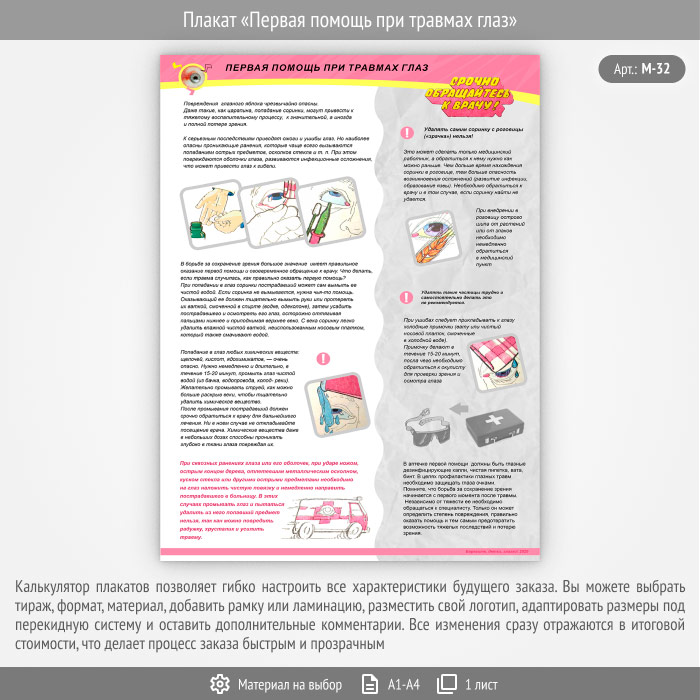 Плакат «Первая помощь при травмах глаз» (М-32, 1 лист) в Альметьевске купить