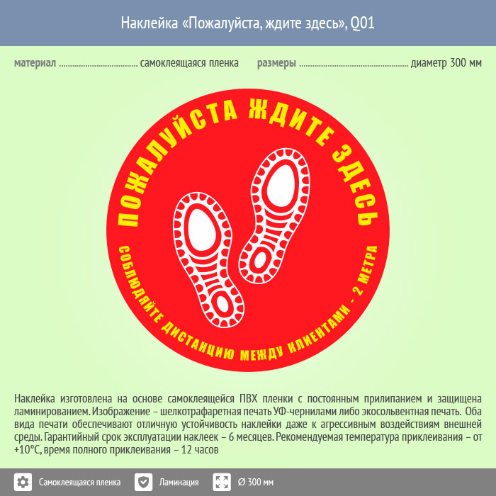 Наклейка на пол «Пожалуйста, ждите здесь», Q01 используется на время карантина для напоминания о необходимости соблюдения дистанции. Согласно постановлению главы Роспотребнадзора Анны Поповой от 1 апреля, все жители России должны соблюдать дистанцию и не подходить друг к другу ближе чем на один метр. В сообщении говорится, что ограничения не распространяются на поездки в легковых такси