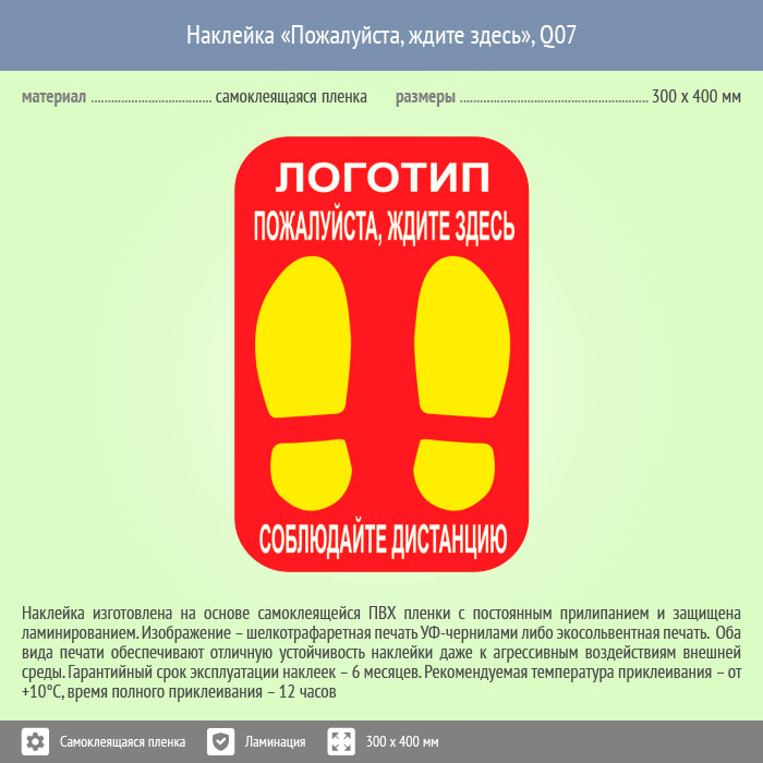 Наклейка на пол «Пожалуйста, ждите здесь», Q07 используется на время карантина для напоминания о необходимости соблюдения дистанции. Согласно постановлению главы Роспотребнадзора Анны Поповой от 1 апреля, все жители России должны соблюдать дистанцию и не подходить друг к другу ближе чем на один метр. В сообщении говорится, что ограничения не распространяются на поездки в легковых такси