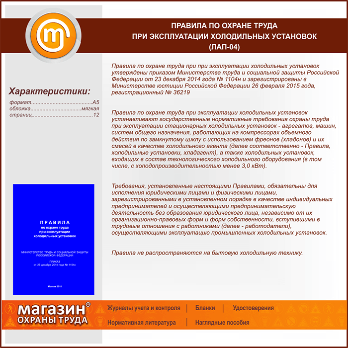 Правила по охране труда при эксплуатации холодильных установок (Приказ Минтруда РФ от 23.12.2014 №1104н) (ЛАП-04) в Альметьевске купить