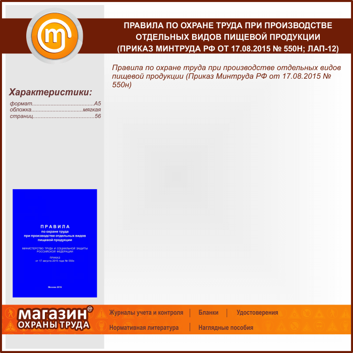 Правила по охране труда при производстве отдельных видов пищевой продукции (Приказ Минтруда РФ от 17.08.2015 № 550н) (ЛАП-12) в Альметьевске купить