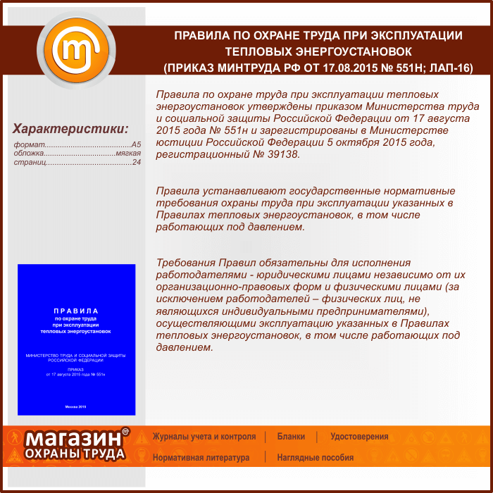 Правила по охране труда при эксплуатации тепловых энергоустановок (Приказ Минтруда РФ от 17.08.2015 № 551н) (ЛАП-16) в Альметьевске купить
