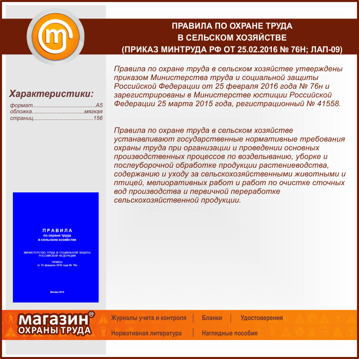 Правила по охране труда в сельском хозяйстве (Приказ Минтруда РФ от 25.02.2016 № 76н) (ЛАП-09) в Альметьевске купить